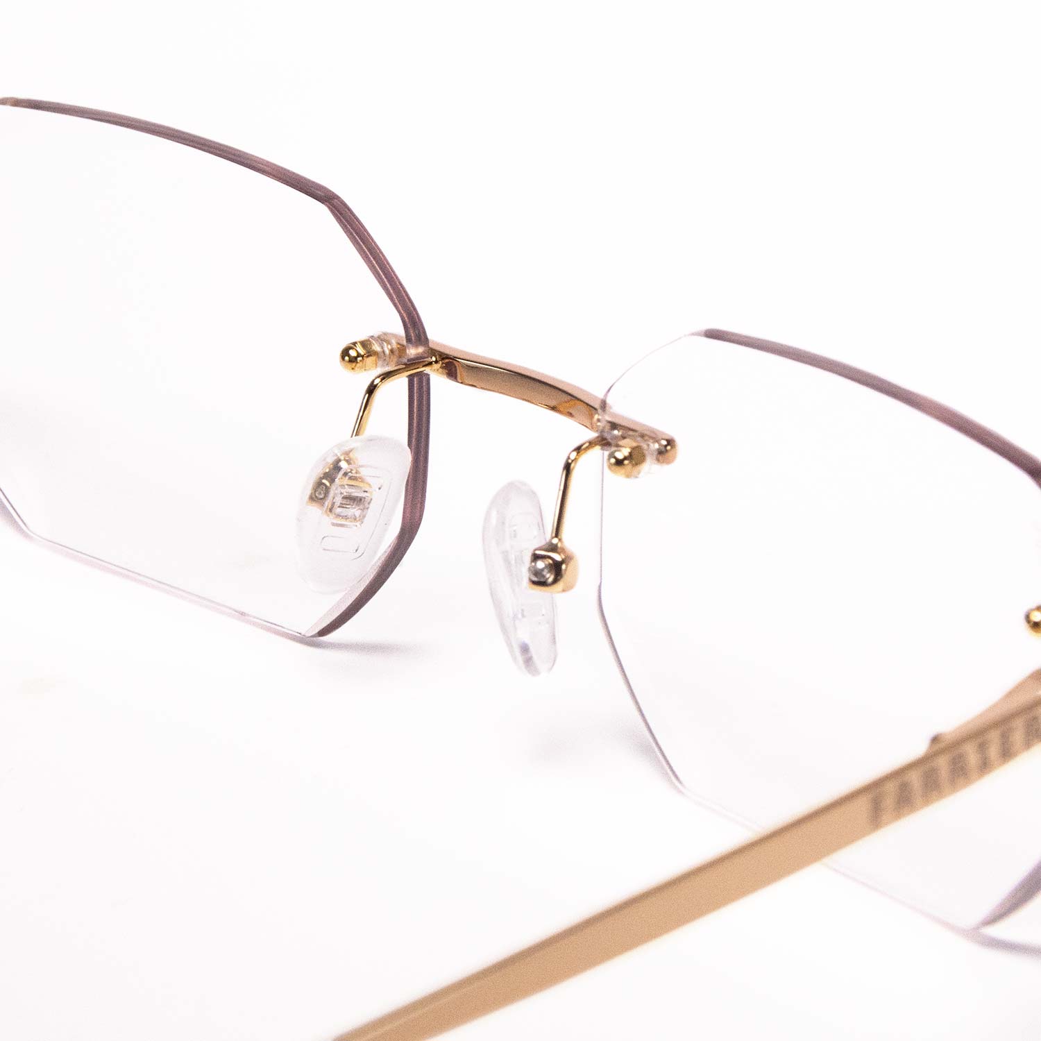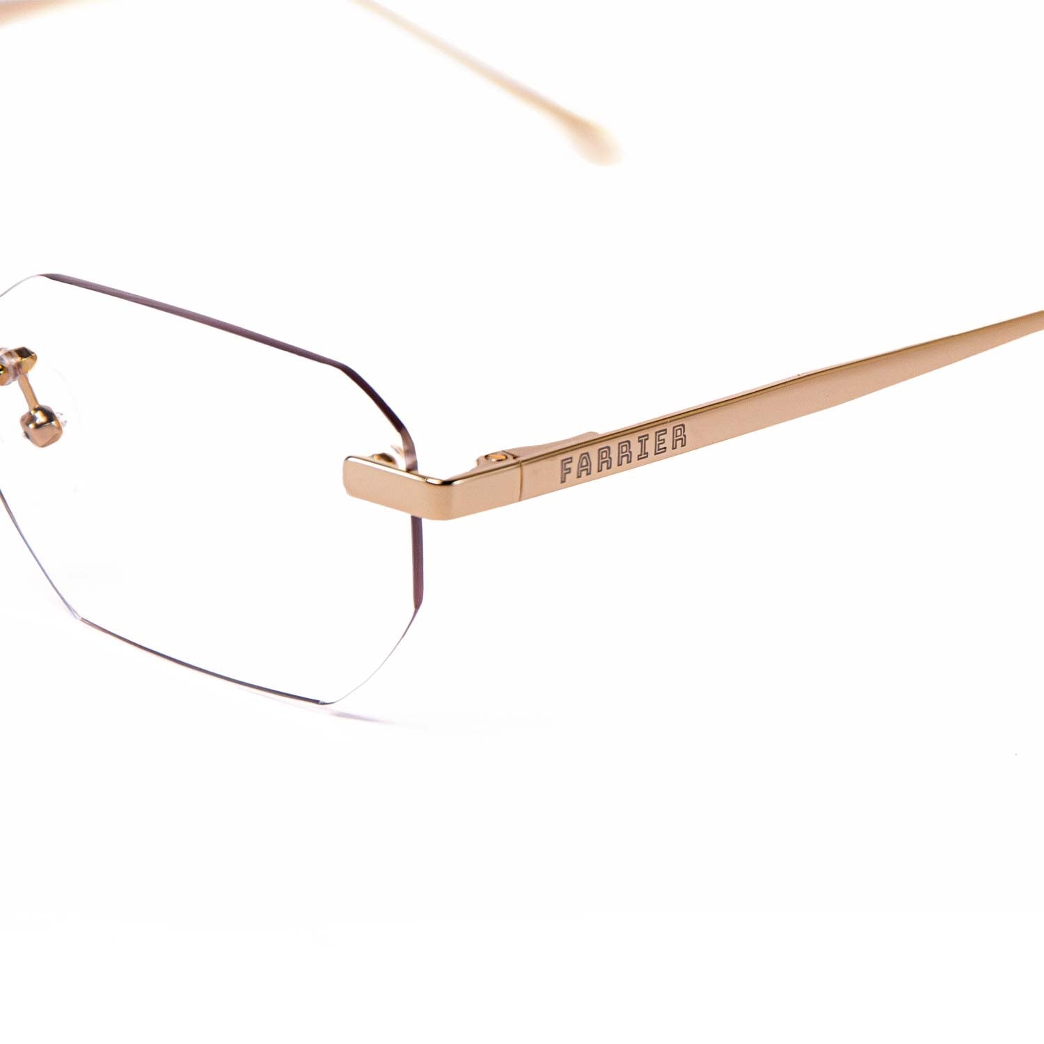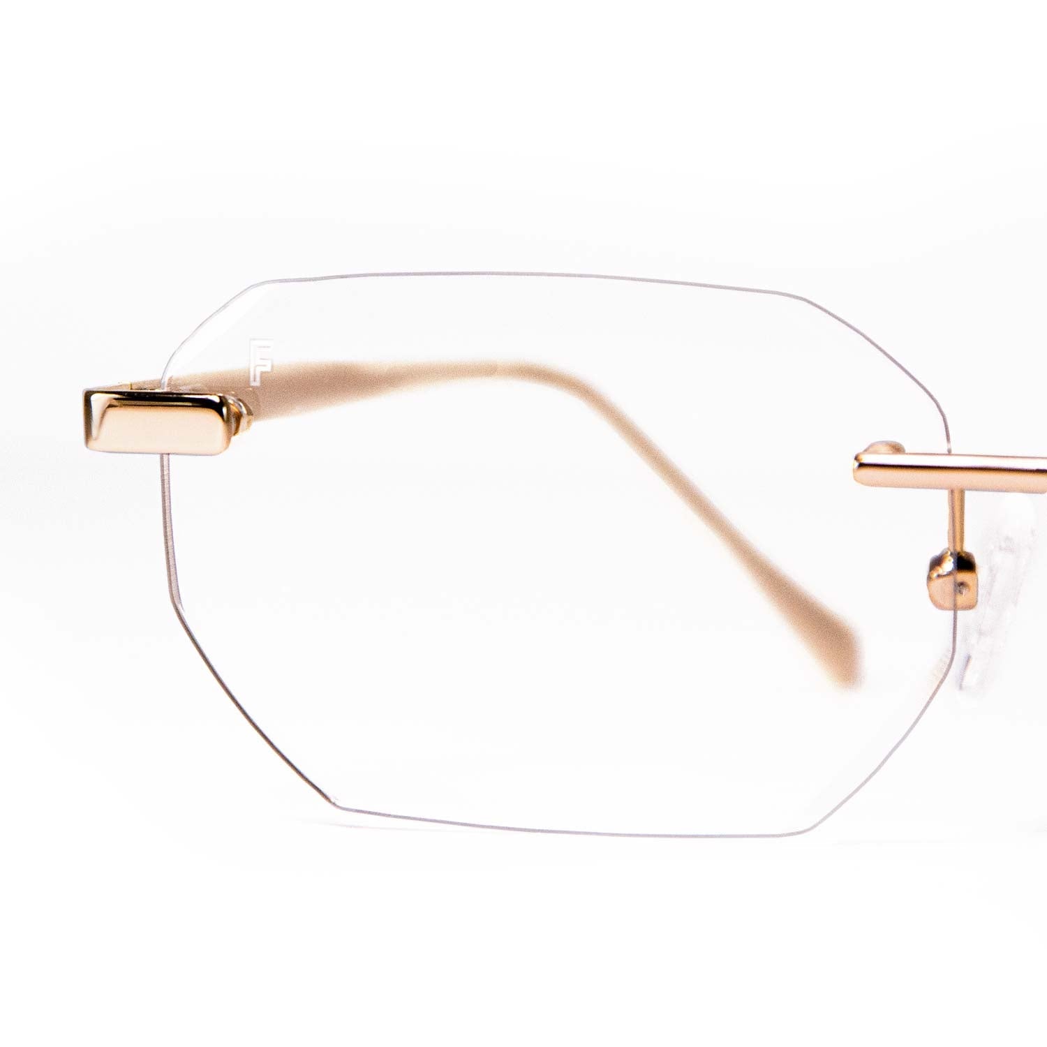 Het is een bril voor zowel man en vrouw met doorzichtige glazen / lenzen. De lenzen zitten aan het goudkleurige montuur zonder randen om de glazen. Het strakke en hoekige ontwerp zorgt voor een unieke look. Daarnaast is het voorzien van filter waardoor blauwlicht aanzienlijk verminderd wordt en je minder snel vermoeid raakt van het kijken naar een scherm.